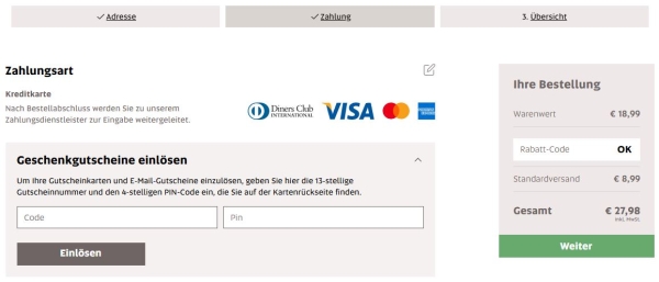 Gutscheinkarten und Geschenkgutscheine (Papier oder E-Mail) können Sie im Schritt "2. Zahlung" mittels Code und Pin einlösen: