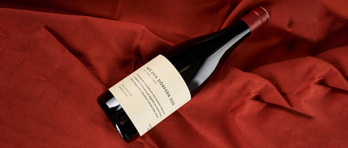 Rotweinflasche mit Etikett auf rotem Stoffhintergrund.