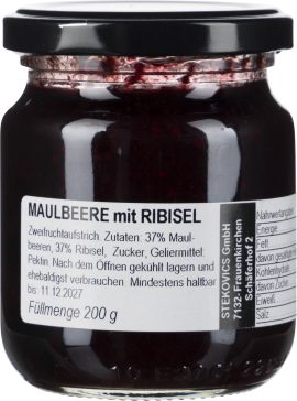 Erich und Priska Stekovics besitzen 400 Maulbeerbäume mit roten, weißen, schwarzen und rosafarbenen Früchten, die vor allem Gänsefutter produzieren. Nach der Devise „Die guten ins Töpfchen“ wird der beste Teil allerdings zu Marmelade verkocht. Um die feigenartige Süße der Maulbeeren auszugleichen, sind Ribiseln mit ihrer Frische die perfekte Wahl. So entsteht eine süßsaure Marmelade, die willkommene Abwechslung auf den Frühstückstisch bringt.