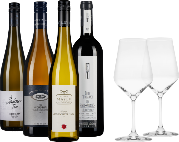 Vier SALON Weine mit Spitzenbewertungen und zwei hochwertige Gläser geschenkt – mit diesem Probierpaket dringen Sie für einen erschwinglichen Preis in die Top-Liga des österreichischen Weins vor.
