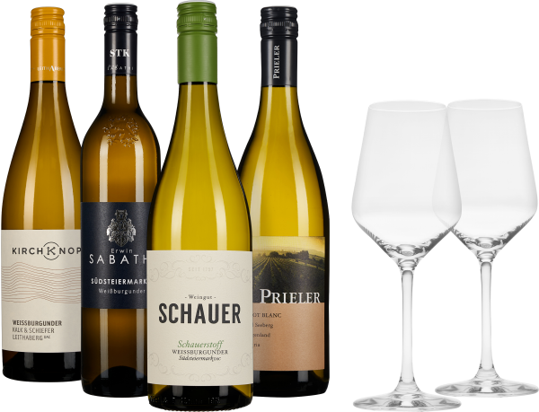 Vier erstklassige Weißburgunder also – jeder davon hochwertig und eigenständig. Besondere Freude machen die Weine aus den beigelegten Weingläsern von Stölzle-Lausitz – lassen Sie ihnen ruhig Zeit, sich zu entwickeln!
