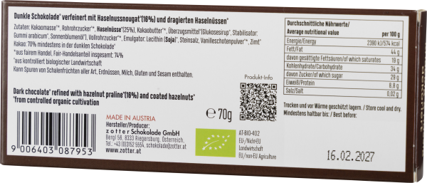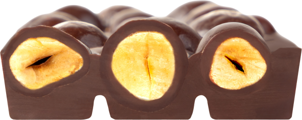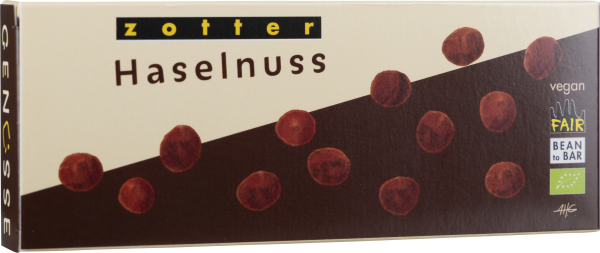 Puristisch und verführerisch ist die Haselnuss-Schokolade von Zotter: Karamellisierte ganze Haselnüsse, umhüllt mit Haselnussnougat, eingelassen in dunkle Schokolade mit 70 Prozent Kakaoanteil, ergeben knackigen, nussigen, veganen Knabberspaß der Extraklasse.