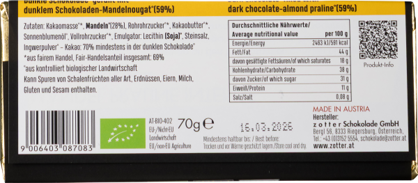 Dunkel geröstetes Mandelnougat, Edelschokolade mit 80 Prozent Kakaoanteil und eine Prise Salz ergeben die Füllung für diese intensive Schokolade für Purist:innen und High-End-Gourmets. Umhüllt ist die Kreation abermals mit einem hauchdünnen Mantel aus 80-prozentiger Schokolade sowie einer weiteren Hülle aus 70-prozentiger Schokolade. Natürlich bio und handgeschöpft, außerdem vegan.